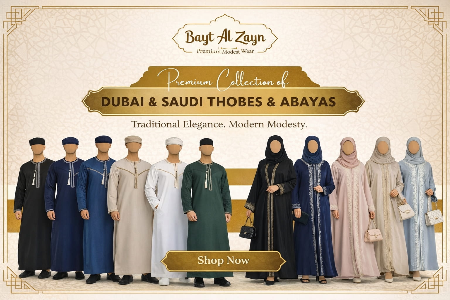 Bayt Al Zayn offers a wide range of men’s thobes and women’s abayas, inspired by classic Islamic styles while incorporating contemporary cuts and premium fabrics. Our collections include elegant designs influenced by Saudi, Emirati, Omani, and Moroccan aesthetics, making them suitable for both traditional gatherings and modern daily wear.